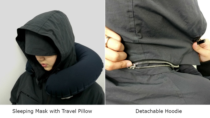 후드는 지퍼를 통해 탈부착이 가능하다. 방수 기능을 갖췄는데 지퍼까지 방수처리를 했다. 지퍼틈을 촘촘히 막아 빗물이 들어가지 않는 구조다. 여행용 목 베개는 후드 안쪽에 있다. 입으로 두번만 불면 빵빵하게 부풀어 오른다고. 후드 안쪽에는 숙면을 돕는 안대까지 있다.