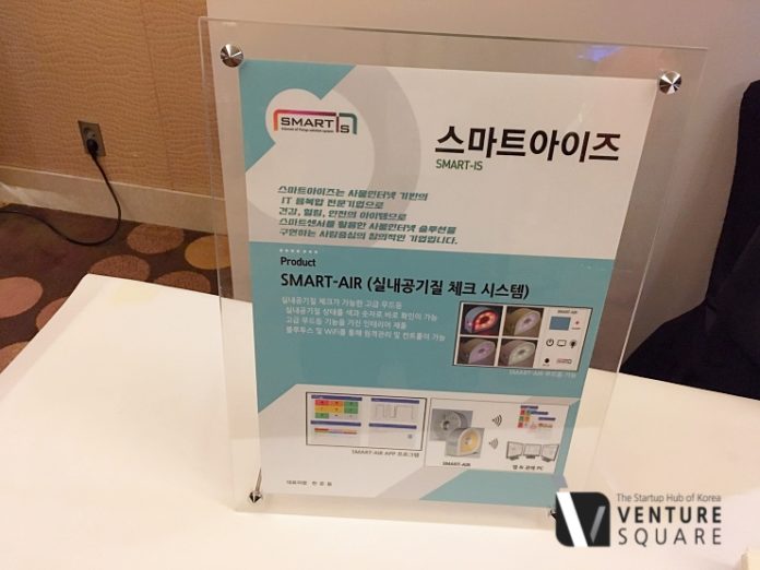 스마트 아이즈의 스마트-에어(Smart-Air)는 아웃도어용 실시간 공기질 체크 솔루션이다. 미세먼지, 연기 등 화재나 질식 폭발 등의 위험을 미리 감지해 알려줄 수 있는 시스템으로 와이파이, 블루투스, LoRa(LongRange, 저전력 장거리 통신)를 지원한다. 지금은 상시 전원을 공급받아 구동되지만 휴대 가능한 배터리 방식으로 바뀔 예정이다. 4단계로 색상으로 공기질을 알려주고, 온도/습도 표시 기능과 위험상황에선 경보음과 함께 사용자 스마트폰, 관제센터에 알려준다.