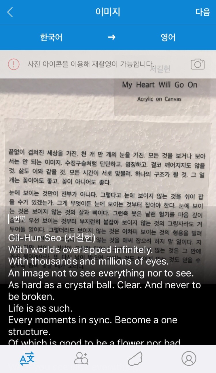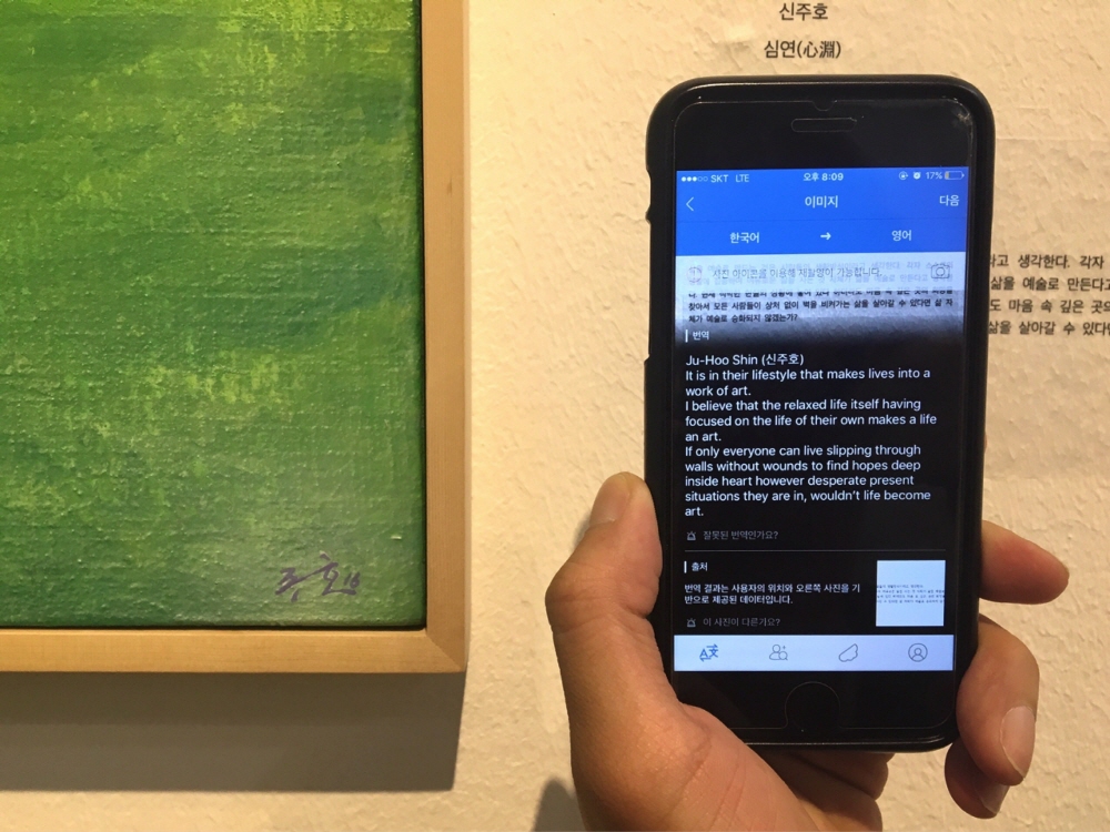 이번 이미지 번역은 플리토가 전문 번역가 3,000여 명 중에서도 예술 분야 전문가를 추려 직접 번역하고 원어민 검수를 거친 것이다. 또 전시회에선 해외 작가 작품은 작품에 대한 설명을 한국어 번역본으로 따로 배치하지 않았다고 한다. 따라서 플리토 앱을 이용해야 해외 작품에 대한 국문 번역을 볼 수 있다는 설명. 전시회 기간 중 번역 서비스를 이용하려면 플리토 앱을 켠 다음 해당 작품 설명글만 사진으로 찍으면 된다. 플리토에 대한 자세한 내용은 홈페이지를 통해 확인할 수 있다.