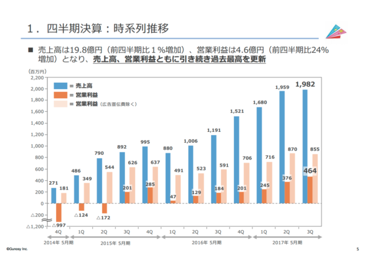 [김상오의 재팬 스타트업] 일본의 구노시 (グノシー)가 2017년 5월기 3분기 결산을 발표했다. 발표에 따르면 구노시는 매출 19억 8,000만 엔(약 207억 원), 영업 이익 4억 6,000만 엔(48억 원)으로 6분기 연속 흑자를 기록했다.
