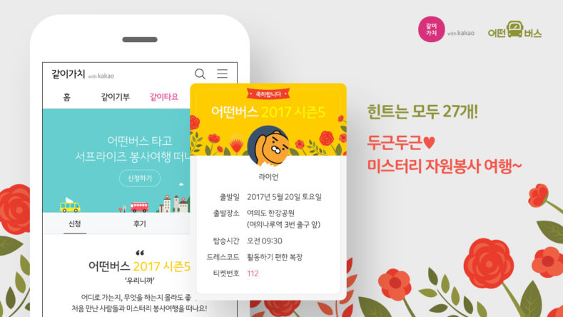 ◇ 카카오, 봉사 여행 참가자 모집=카카오가 ‘같이가치 with kakao’를 통해 미스터리 봉사 여행 ‘어떤버스 2017 시즌5’ 참가자를 모집한다. ‘어떤버스’는 2014년 국내 청년들이 미국의 ‘Do Good Bus’를 벤치마킹해 만든 봉사 활성화 프로젝트다. 어디로 가는지, 어떤 봉사를 하는지 알려주지 않은 채 떠나는 미스터리 봉사라는 차별화된 콘셉트로 지난해까지 연 2회로 진행하던 봉사프로그램을 올해부터는 연 4회로 확대 운영할 계획이다. 2017년 두번째 진행되는 ‘어떤버스 2017 시즌5’는 역대 최대 규모인 620명의 참가자를 모집해 오는 5월 20일 봉사활동을 떠난다. 참가 대상은 뜻 깊은 추억과 색다른 봉사활동을 꿈꾸는 2030세대다. ‘어떤버스 2017 시즌5’는 같이가치 with kakao에서 오는 5월7일까지 신청할 수 있으며, 최종 탑승 후보는 5월 8일에 발표된다. 참가비는 2만원이며 전액 어떤버스 모금함에 기부된다. ‘어떤버스’에 대한 자세한 정보는 공식 홈페이지에서 확인할 수 있다.