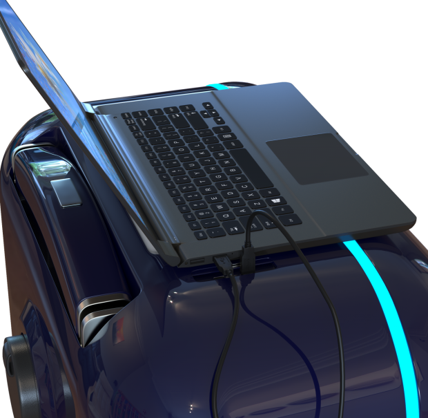 본체에는 USB 단자 2개를 갖추고 있어 스마트폰 같은 작은 모바일 기기는 언제든 충전할 수 있다. 또 상단은 평평하게 디자인해 간단하게 노트북 받침으로 이용할 수도 있다. 내장 배터리는 앱을 통해 확인할 수 있다. 배터리는 완전 자동 모드 기준으로 4시간, 대기모드에선 100시간 작동한다. 배터리와 내장 모터 용량은 가방 전체 중 5% 수준이기 때문에 무게 자체가 주는 부담은 크지 않다. LED 조명도 내장했다. 조명색 역시 앱을 통해 사용자 정의할 수 있는 건 물론.