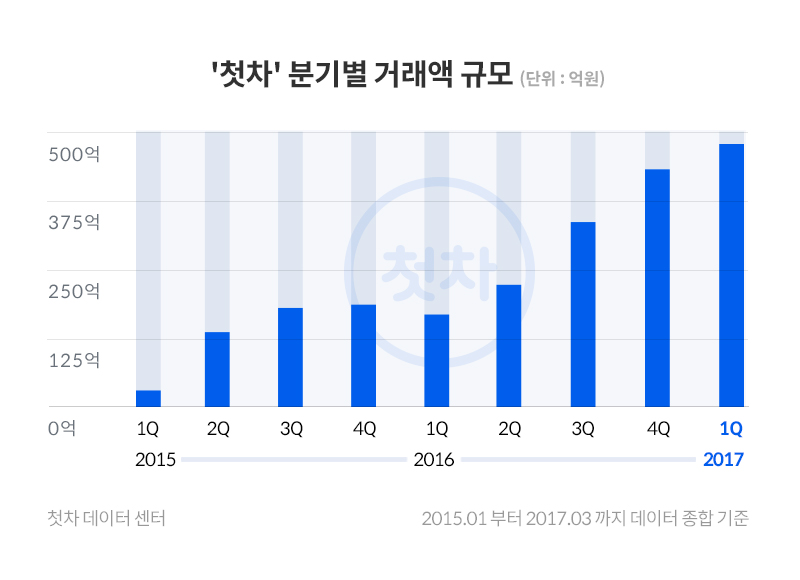 첫차가 1분기 누적 거래액이 2,000억 원을 넘어섰다고 밝혔다. 첫차는 중고차 거래 O2O 서비스. 첫차가 지난 분기 기록한 누적 거래액은 2,180억 원이다. 지난해 8월 누적 거래액 1,000억 원을 넘어선 이후 6개월 만에 200% 넘게 성장했다. 첫차를 서비스 중인 미스터픽 측은 올해 1분기 들어 월 평균 거래액 역시 160억 원을 넘는 등 거래액도 최고치를 기록했다고 덧붙였다. 첫차의 월 거래액은 평균 14.2%씩 성장세를 보이고 있다.