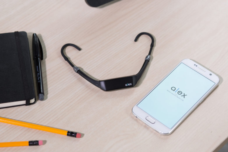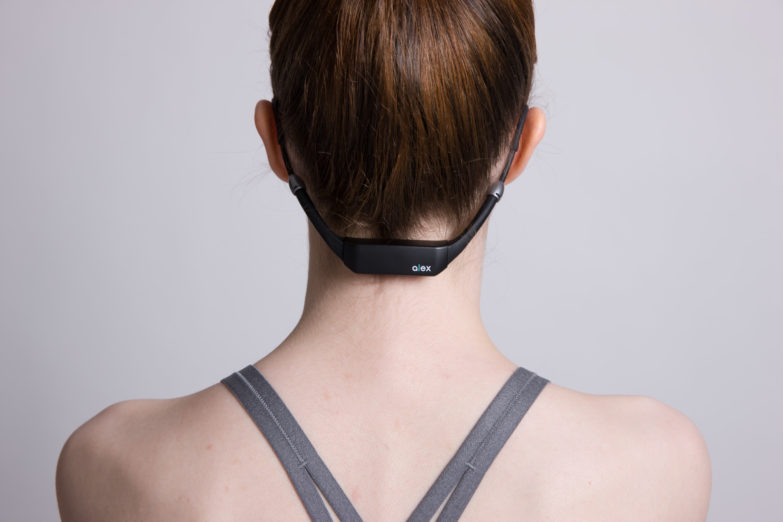 자 이제 알렉스에 대해 본격적으로 알아보자. 한마디로 설명하자면 알렉스는 IT 기기를 바른 자세로 사용할 수 있도록 도와주는 웨어러블 기기다. 넥밴드 형태의 블루투스 헤드셋처럼 생긴 본체를 착용하면 무의식적으로 원래 습관처럼 나쁜 자세로 사용자가 흐트러질 때마다 진동을 통해 알려준다.
