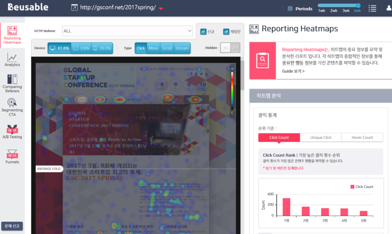 현재 무료로 베타서비스 중인 뷰저블을 이용해 5월23(일) 벤처스퀘어가 주관한 글로벌스타트업컨퍼런스(GSC)페이지 방문자 행태를 약 한달 간 분석해봤다. 행사 안내, 연사소개 그리고 사전 등록 등 아주 간단한 기능만 넣은 페이지이기 때문에 분석툴로 분석하는 것이 큰 의미는 없지만 개괄적으로 뷰저블을 이용해서 얻을 수 있는 정보를 파악하기 위해 시험해 봤다.