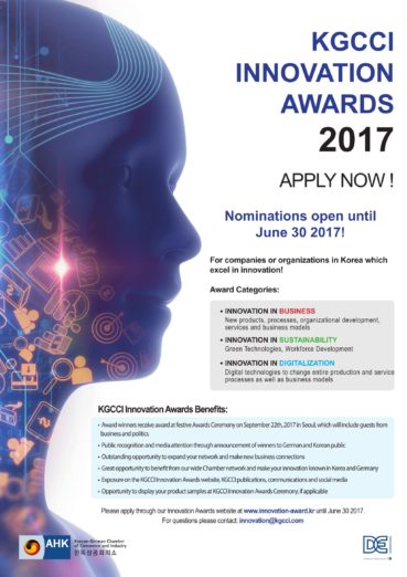 ◇ 한독상공회의소, 이노베이션 어워드 개최=한국상공회의소가 2017 이노베이션 어워드를 개최한다. 이번 공모전은 한국에서 활동중인 모든 기업을 대상으로 혁신적인 아이디어와 콘셉트·제품·서비스 등을 보유하고 있는 우수 기업을 선정하고 홍보하는 자리다. 참가를 원하는 기업은 온라인을 통해 6월30일까지 등록 가능하며 시상식은 9월 22일에 열린다. 자세한 내용과 신청은 한독상공회의소 이노베이션 어워드 홈페이지에서 확인 가능하다.