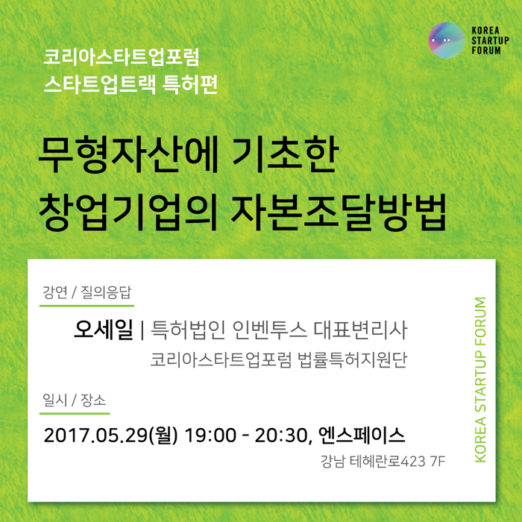 ◇ KSF, 스타트업 트랙-특허편 강연=코리아스트타업포럼이 오는 29일 엔스페이스에서 ‘스타트업 트랙 – 특허편’ 강연 개최한다. 스타트업 트랙은 스타트업 업계의 주요 이슈를 살펴 분기별 다양한 주제를 선정해 분야의 전문가와 스타트업이 함께하는 강연/토론의 자리다. 이번 강연은 ‘무형자산에 기초한 창업기업의 자본조달방법’을 주제로 강연이 진행된다. 자세한 정보와 참가 신청은 온오프믹스를 통해 가능하다.