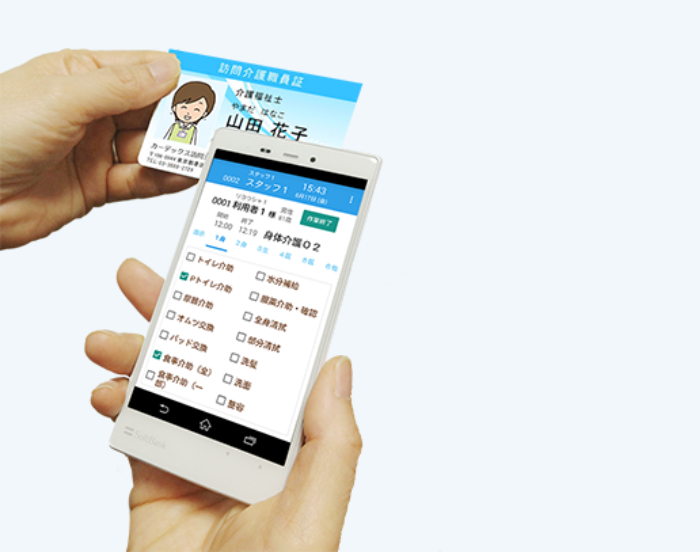 케어-윙(care-Wing)은 스마트폰을 이용해 근태 관리를 할 수 있게 해주는 간호사업자용 지원 시스템이다. 간호사업자의 다양한 부담을 줄여주기 위해 만든 지원 시스템인 것. 간호사업자는 케어-윙을 이용하면 간호 현장을 IT화하고 종이가 없는 페이퍼리스를 실현할 수 있다. 이를 통해 사무 처리 부담을 줄일 뿐 아니라 청구 오류 방지, 경비 절감 같은 효과를 기대할 수 있다. 표 작성이나 각종 서비스 계획서 작성, 서비스별 임금 계산 등을 시스템으로 수행할 수 있다.