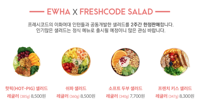 프레시코드는 최근 이화여자대학교와 산학협력을 맺고 식품영양학과, 보건관리학과, 체육과학부에 재학 중인 인턴 9명과 신매뉴 개발을 진행한 바 있다. 매뉴개발에는 홍성란 요리 연구가가 멘토로 참여했다. 인턴들과 공동 개발한 샐러드 4종은 지난 5월 22일부터 6월 2일까지 컨테스트 방식으로 시범 판매했으며 가장 반응이 좋았던 핫픽(Hot-Pig)과 쉬파 샐러드가 신메뉴로 출시됐다. 매운 샐러드라는 컨셉을 가진 핫픽은 매운 음식을 좋아하는 한국인 입맛에 딱 맞는다는 평이다.