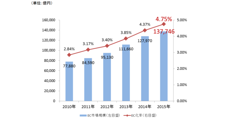 일본 경제산업청이 내놓은 자료를 보면 2015년 일본 온라인 상거래 시장 규모는 약 140조 원(14조 엔). 그 가운데 의류 시장이 10%로 가장 많고 매년 5% 안팎 성장률을 유지하고 있다.