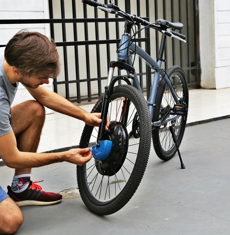 이 제품은 앞바퀴에 장착한 다음 핸들 스로틀을 설치하고 스로틀 케이블에 바퀴를 연결하는 형태를 취하고 있다. 앞서 밝혔듯 이 과정은 60초 정도면 끝난다고 한다. 시중에서 사용 중인 자전거 99%를 전동으로 바꿀 수 있게 해주는 만큼 효용가치가 높다고 할 수 있다.