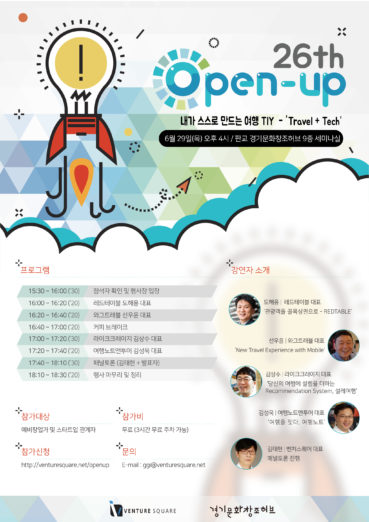 ◇ 벤처스퀘어, 오픈업 세미나 개최=벤처스퀘어가 오는 29일 (목) 오후 4시 판교 경기문화창조허브에서 ‘내가 스스로 만드는 여행( Travel It Yourself)’란 주제로 트레블테크(Travel+Tech) 관련 스타트업이 참가한다. 1부는 도해용 대표(레드테이블)와 선우윤 대표(와그트래블), 2부에서는 김상수 대표(라이크크레이지)와 김성욱 대표(여행노트앤투어)가 서비스를 소개하고 국내외 여행/관광 서비스 시장과 향후 전망에 대한 토론이 펼쳐질 예정이다. 오픈업 세미나 참가비는 무료로 신청은 여기로 하면 된다.