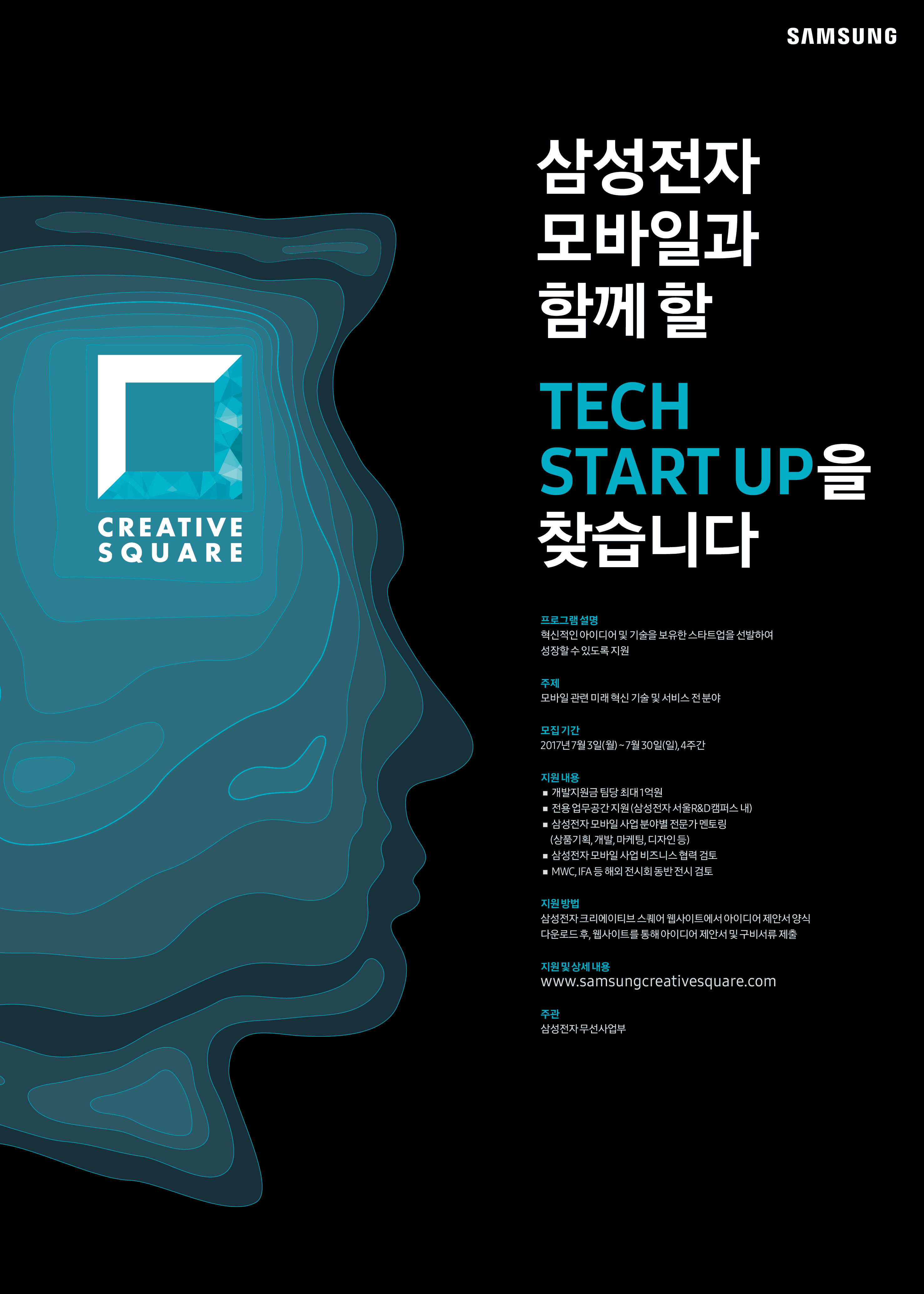 삼성전자가 모바일 관련 아이디어와 기술을 보유한 스타트업을 발굴 양성하기 위해 ‘크리에이티브 스퀘어 3기’ 공모전을 진행한다. 크리에이티브 스퀘어는 모바일에 관련한 혁신 아이디어를 지닌 스타트업을 찾기 위한 스타트업 인큐베이션 프로그램으로 앞서 진행된 1, 2기 프로그램을 통해 선정된 스타트업 15개가 삼성전자의 지원을 받고 있다.