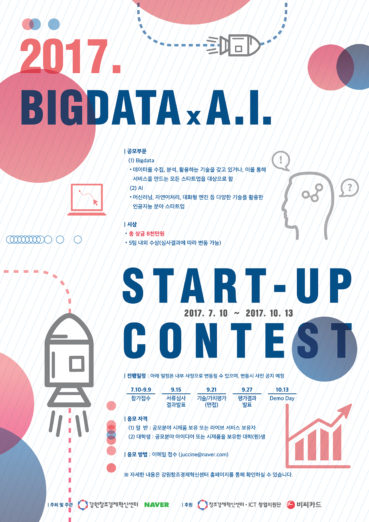 ◇ 강원혁신센터, 빅데이터 · 인공지능 스타트업 공모전 개최=강원혁신센터가 네이버와 함께 ‘빅데이터 · 인공지능 스타트업 공모전’을 개최한다. 이번 공모전은 데이터 분석 기반기술을 활용한 서비스 스타트업, 인공지능 관련 스타트업 등을 발굴하여 육성하는 것을 목표로 진행된다. 강원센터는 공모전을 통해 서류심사와 면접을 통한 기술·가치평가, 시연평가 등의 심사과정을 거쳐 최종 5팀을 선발할 예정으로 선발된 팀에게는 국내 최대규모인 총 8,000만원의 상금이 수여된다. 또한 네이버의 스타트업 지원 프로그램인 NPAC 무료 제공, 강원센터 입주공간 지원 등의 특전을 제공할 예정이며 사업 아이템의 성격에 따라 네이버와 컬래버레이션 할 수 있는 기회도 제공된다. 자세한 사항은 강원센터 홈페이지 창업지원 프로그램 페이지에서 확인 가능하며, 참가를 원하는 스타트업은 7월 10일부터 9월 9일까지 이메일로 지원하면 된다.