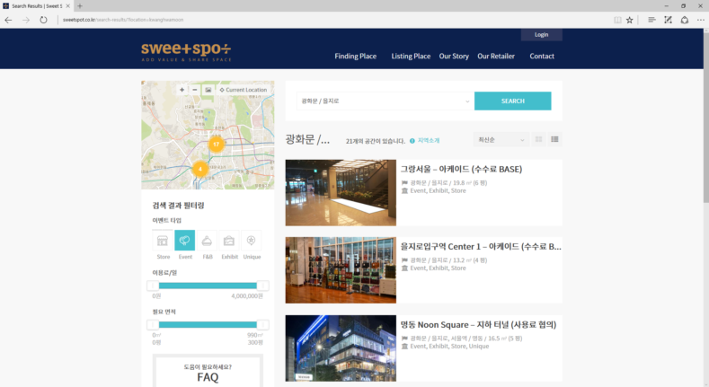 공간을 임대하고자 하는 리테일러는 스위트스팟 웹사이트에서 지역, 비용, 용도에 따라 원하는 공간을 검색 하고 공간 임대를 신청할 수 있다. 지역을 선택한 후 이벤트 타입과 필요 면적 등을 입력하면 임대 가격을 확인할 수 있다. 현재 스위트스팟에 등록된 건물은 테헤란로, 광화문, 동대문구, 서울역, 여의도 등 역세권 주요 상업지역에 위치한 GFC, 서울스퀘어, 센터원, 여의도 IFC MALL등 약 100개다.