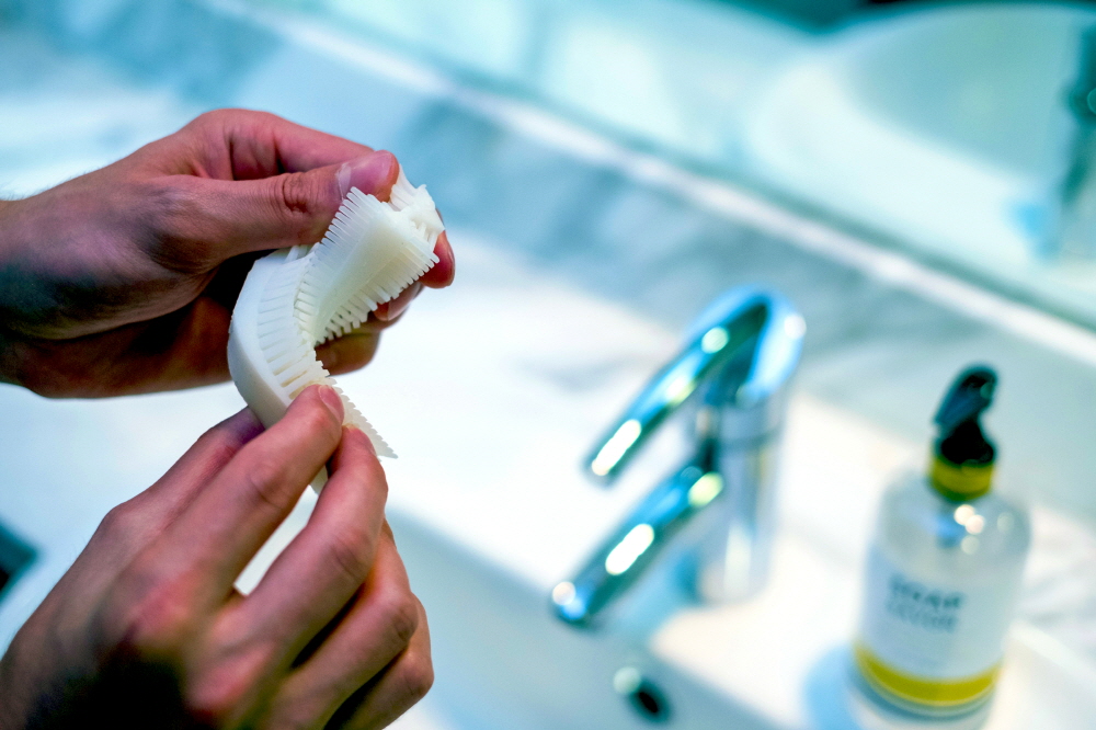 아마브러시는 마우스피스처럼 생겼기 때문에 입에 넣고 본체 앞쪽에 위치한 버튼을 누른다. 본체가 진동을 하기 때문에 손을 움직일 필요 없이 알아서 모든 치아를 자동으로 닦아준다. 양손이 자유로운 만큼 칫솔질을 하면서 다른 출근 준비를 할 수도 있다. 또 칫솔질이 끝나면 본체를 입에서 뺀 다음 마우스피스에서 핸드피스를 분리, 전용 트레이에 끼워두면 된다.