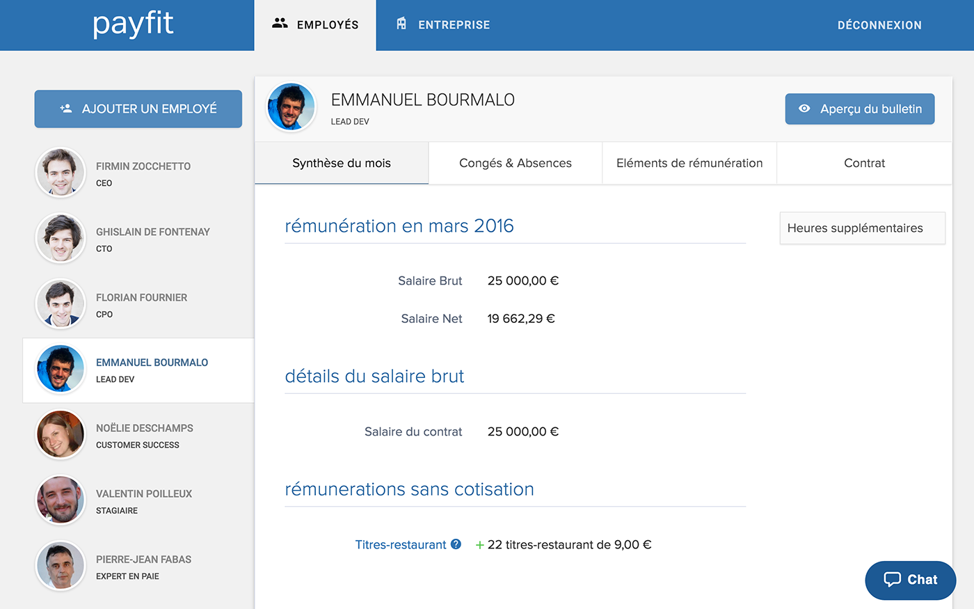 페이피트는 또 프랑스 스타트업에 필요한 기본 관리 기능을 하나로 통합했다. 경비를 관리하고 다가올 휴일을 살펴본 뒤 휴가를 요청할 수도 있다. 조직도와 자회사 관리, 일정 관리나 보안 저장 기능도 제공한다.