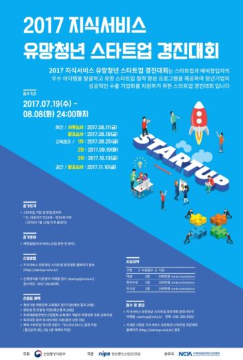 ◇ NIPA, 유망 청년 스타트업 경진대회 참가자 모집=정보통신산업진흥원(이하 NIPA)은 우수 아이템을 발굴하고 유망 스타트업 질적 향상 프로그램을 제공해 성공적인 수출 기업화를 지원하기 위한 ‘2017 지식서비스 유망 청년 스타트업 경진대회’를 개최한다. 이번 대회는 독창적이고, 혁신적인 아이디어를 가지고 있는지식서비스산업 전 분야 스타트업 및 예비 창업자는 누구나 참여가 가능하다. 상위 3팀에게는 투자피칭행사에 참여하여 투자유치 기회를 제공한다. 또한, 전세계의 스타트업과 투자자들이 모이는 유럽 최대 스타트업 컨퍼런스 핀란드 「SLUSH 2017」참관을 지원한다. 참가 신청은 홈페이지를 통해 참가 신청이 가능하다.