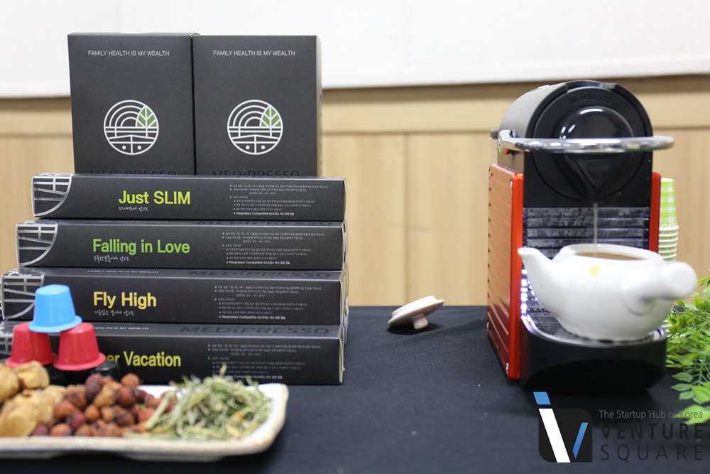 ◇메디프레소= 한방차를 에스프레소 커피처럼 추출할 수 있다면? 기존에 출시된 제품은 한방차의 맛과 향을 그대로 즐기기 어려웠다. 티백형태는 잘못 우려내면 밋밋하거나 떫은맛이 나기도 했다. 중탕 기기는 맛은 유지되지만 1시간 이상 뜨거운 열로 우려내야하는 불편함이 있었다. 메디프레소는 한방차를 로스팅, 블랜딩해서 즐길 수 있는 한방차 전용 기기와 캡슐을 통해 이런 불편함을 해소한다. 전용머신을 이용하면 각각에 맞는 온도와 추출시간을 설정할 수 있다. 캡슐형 메디프레소는 기존 캡슐커피머신과 호환가능해 기기 없이도 한방차를 즐길 수 있다는 설명이다. 현재 다이어트, 피부미용 숙취 해소, 스트레스 해소 등 효능에 따라 블렌딩 한 12가지 한방차를 선보이고 있다.