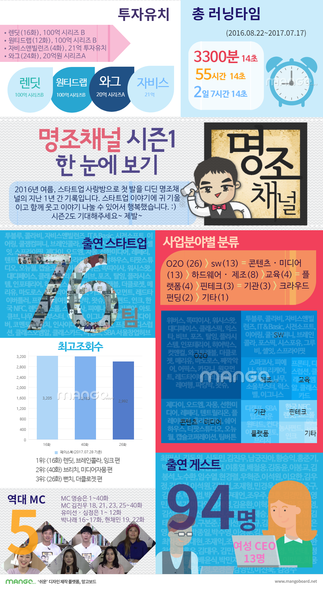 2016년 8월 22일, 스타트업 전문방송 명조채널이 첫 선을 보였다. 40화를 끝으로 시즌1을 마무리하기까지 76개 스타트업 팀과 94명의 스타트업이 명조채널을 다녀갔다. 지난 1년간의 러닝타임을 분으로 환산하면 약 3,300분이다. 명조채널이 스타트업과 함께 한 1년의 시간을 모아봤다. 물론 지난 1년동안 함께 하는 팀원, 부모님, 배우자, 소중한 사람에게 보내는 영상편지와 같이 수치로 환산할 수 없는 순간도 명조채널에 쌓여있다. 미처 담지 못한 스타트업의 순간들은 명조채널 지난 화에서 확인할 수 있다.