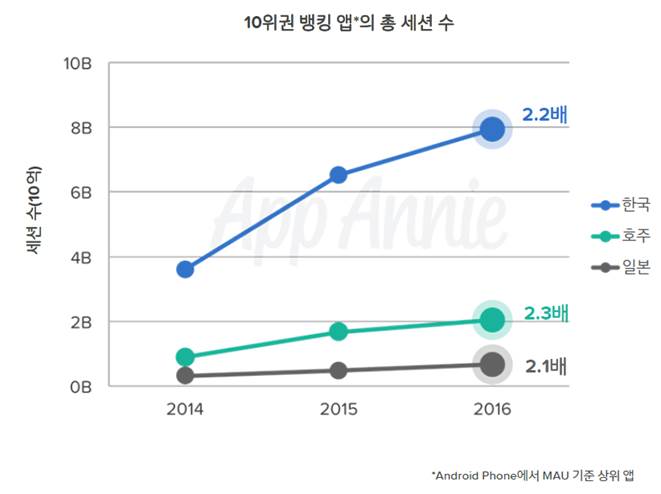 모바일 뱅킹 시장에 카카오발 인터넷뱅크 태풍이 몰아치고 있다. 시장분석업체인 앱애니에 따르면 인터넷뱅크가 등장하기 이전만 해도 국내 10위권 뱅킹 앱의 총 세션 수는 80억 회(2016년 안드로이드폰 기준)였다. 하지만 올해 인터넷뱅크 서비스가 등장하면서 이 같은 구도는 급격하게 바뀔 전망. 인터넷뱅크는 8월 3일 기준 200만 개가 넘는 계좌가 개설됐고 수신액도 1조원대에 이른다. 이렇게 인터넷뱅크 태풍이 불면서 기존 은행도 모바일 뱅킹 앱 서비스가 바뀌어야 한다는 압박이 강해지고 있다.