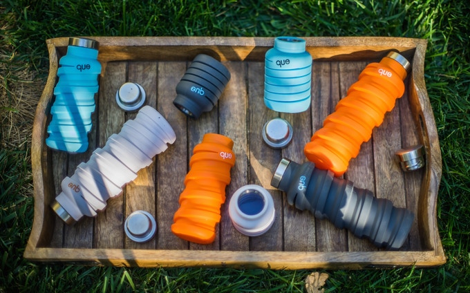 QUE보틀(que Bottle)은 물을 다 마신 뒤에는 크기를 줄여 압축시키는 등 신축성을 더한 100% 재활용 가능한 실리콘 재질 병이다. 이 제품은 절반까지 크기를 줄일 수 있다. 100% 식품용 실리콘으로 만들어진 제품이기도 하다. 용량은 355ml와 600ml 2가지 가운데 고를 수 있어 용도에 따라서 구분해서 쓸 수도 있다.