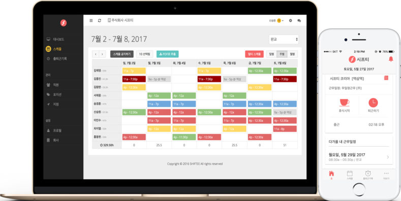 시프티(shiftee)는 이처럼 직원의 근무 스케줄링과 근태 관리에 불편함을 느끼는 관리자와 직원을 위한 스마트 출퇴근 기록 및 스케줄러다. 시프티를 이용하면 PC와 모바일을 통해 직원의 출퇴근 여부를 실시간으로 확인 할 수 있으며 근무 일정 짜기와 일정 업데이트도 손쉽게 할 수 있다.