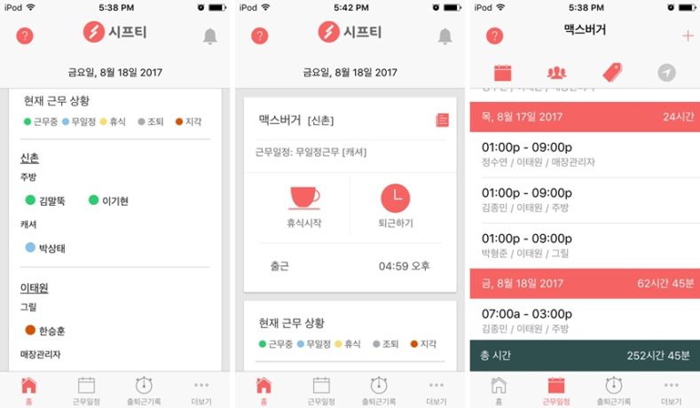 출퇴근 기록은 와이파이 기반으로 이뤄진다. 직원이 출근지에 도착해야만 출근체크를 할 수 있어 대리출근은 불가능하다. 관리자는 모바일 알람으로 쉽게 직원이 출근했는지 확인할 수 있다. 스케줄 된 근무일정에 출근 기록이 없거나 퇴근시간이 지나도 퇴근 기록이 없으면 관리자와 직원 모두에게 푸시 알람이 간다. 또 직원들의 현재 근무상황도 실시간으로 보여주기 때문에 지금 어떤 직원이 어디에서 근무를 하고 있는지, 휴식을 취하고 있는 직원은 누구인지 등도 확인할 수 있다. 관리자는 직원을 감시하지 않아도 되고 직원은 눈치 보지 않고 휴식을 취할 수 있어 효율적인 업무는 물론 직원 간 신뢰도도 높일 수 있다. 시프티는 관리자와 직원이 각기 다른 앱을 사용하는 것이아니라 하나의 앱만 다운받아 사용하면 된다.