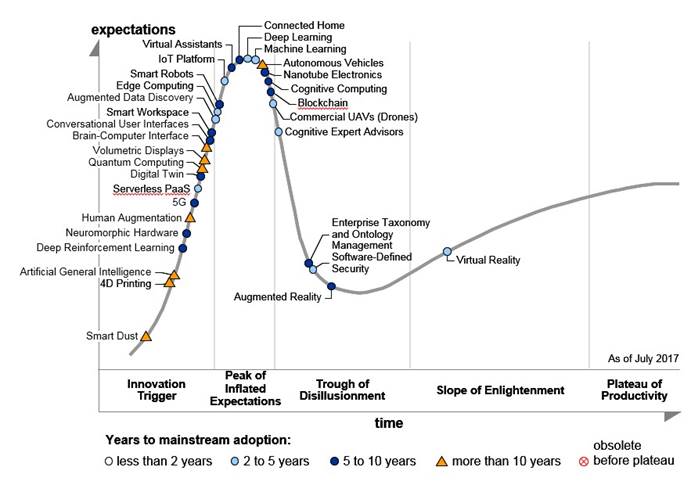 가트너가 배포한 2017년 ‘신기술 하이프 사이클 보고서(Hype Cycle for Emerging Technologies)에 따르면 세 가지 주요 기술 트렌드로 ‘인공 지능(AI)과 순수 몰입 경험(Transparently immersive experiences), 그리고 디지털 플랫폼’을 꼽았다. 2천여 개 이상의 기술에서 얻은 인사이트를 바탕으로 반드시 주목해야 할 주요 신기술·트렌드를 간추려 낸 결과다.