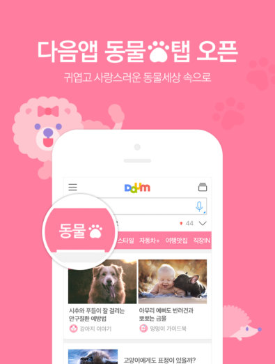 카카오가 국내 포털 서비스 최초로 다음앱 및 모바일 다음에 ‘동물’ 탭을 개설했다. 앞서 꺼낸 국내 반려인구의 증가와 더불어 관심이 급증하고 있는 트렌드를 반영한 결과다. 다음앱 및 다음 모바일 첫 화면에서 제공 중인 ‘탭’ 은 각 주제별 콘텐츠를 모아 제공하는 카테고리다. 현재 뉴스, 랭킹 등 기본적인 카테고리를 비롯해 홈앤쿠킹, 스타일, 자동차, 여행맛집 등 현재 총 13개의 탭을 통해 사용자 입맛에 맞는 콘텐츠를 공급 중이다.