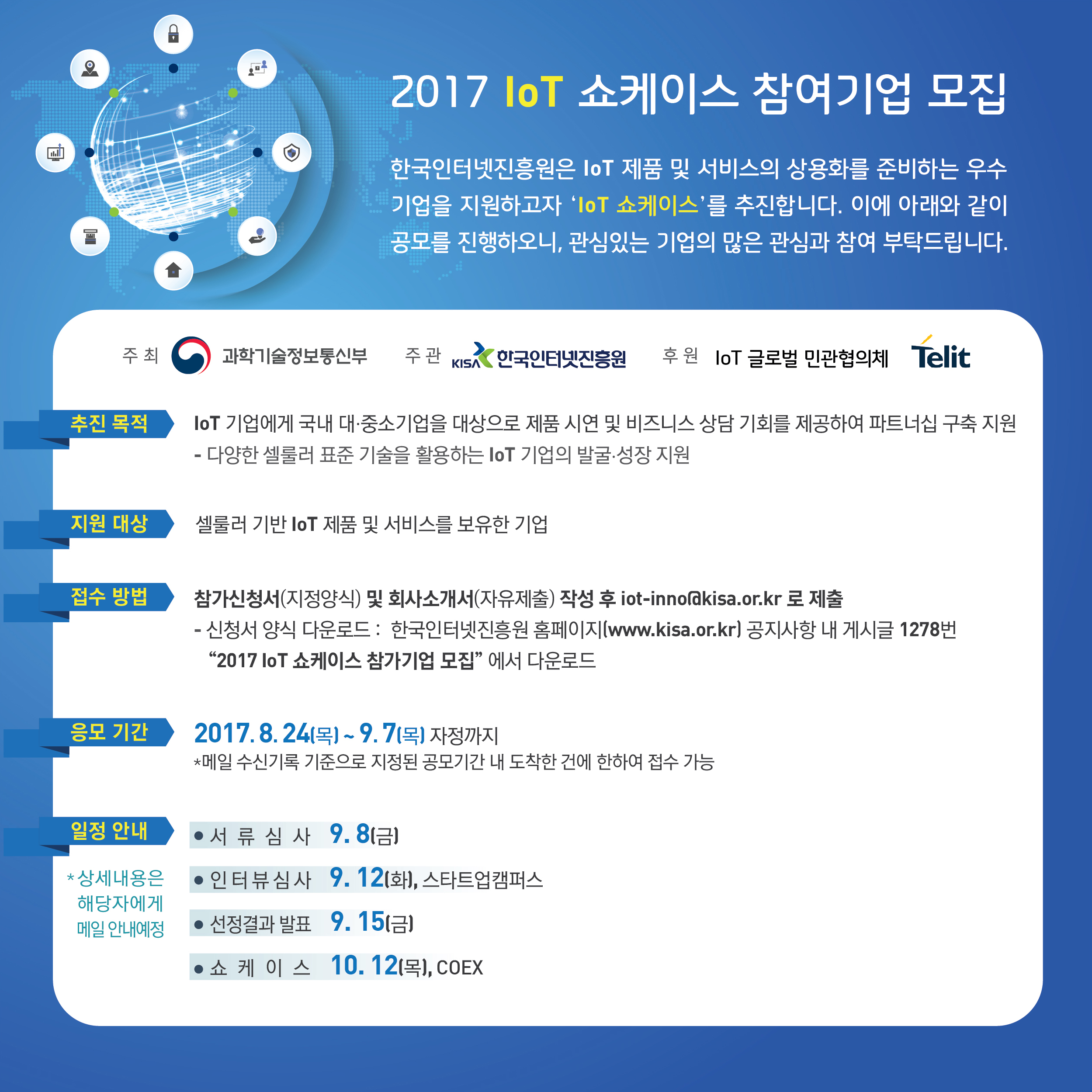 한국인터넷진흥원이 IoT 제품 및 서비스의 상용화를 준비하는 우수 기업 지원을 위한 ‘IoT 쇼케이스’의 참가 기업을 모집한다.