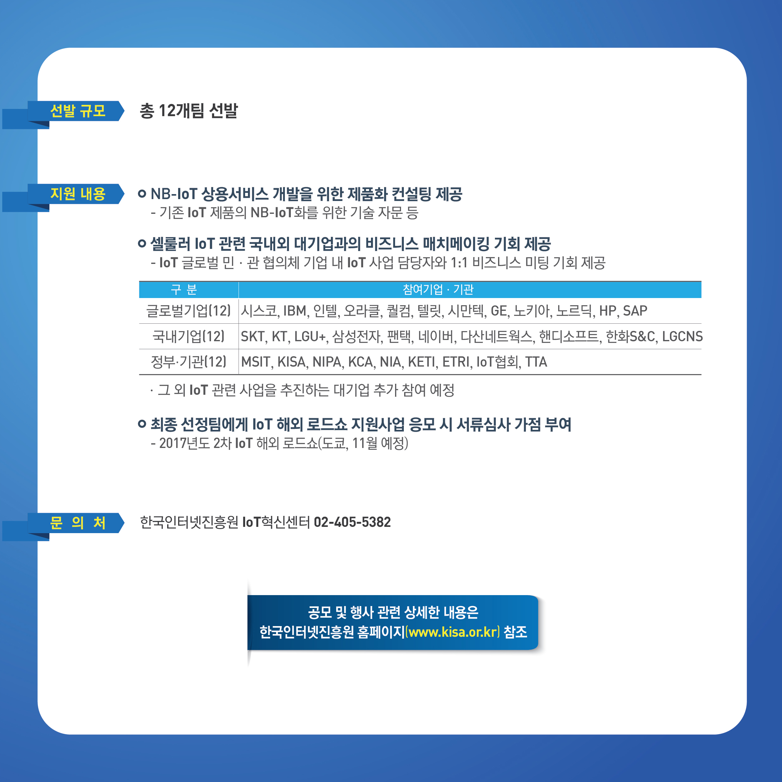 참가 기업은 NB-IoT 상용서비스 개발을 위한 제품화 컨설팅 제공 셀룰러 IoT 관련 국내외 대기업과의 비즈니스 매치메이킹 기회 제공받게 된다. 또한 IoT 글로벌 민ㆍ관 협의체 기업 내 IoT 사업 담당자와 1:1 비즈니스 미팅, 최종 선정팀에게 IoT 해외 로드쇼 지원사업 응모 시 서류심사 가점을 부여받게 된다. 2017년도 2차 IoT 해외 로드쇼는 오는 11월 일본 도쿄로 예정되어 있다.