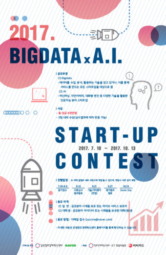 ◇ 강원센터, 빅데이터·A.I 스타트업 공모전 개최=강원창조경제혁신센터가 ‘2017 빅데이터 · A.I. 스타트업 공모전’을 개최한다. 우선 빅데이터 분야는 데이터를 수집, 분석, 활용하는 기술을 갖고 있거나 이를 통해 서비스를 만드는 스타트업을 대상으로 한다. 인공지능 분야의 경우 머신러닝, 자연어처리, 대화형 엔진 등 다양한 기술을 활용한 인공지능 분야 스타트업이 해당된다. 응모자격은 일반의 경우 공모분야 시제품 보유 또는 라이브 서비스 보유자, 대학생은 공모분야 아이디어 또는 시제품을 보유한 대학(원)생이 해당된다. 또한 예비창업자 및 창업 7 년 이하의 기업이어야 한다. 상금액은 총상금 8천만원(5팀 내외 선정 예정)으로 참가신청은 오는 9월9일까지 이메일을 통해 접수 받는다.