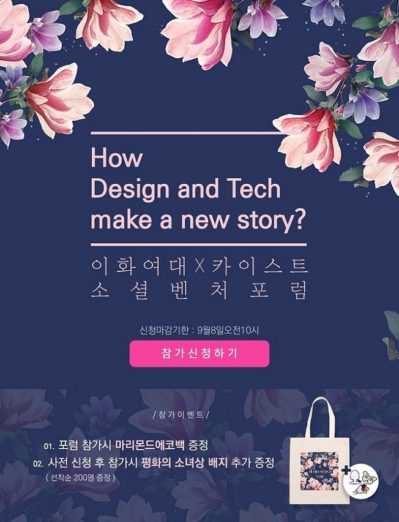 ◇ 카이스트, 소셜벤처포럼 개최=카이스트와 이화여자대학교가 오는 9월 11일 오후2시, 이화여자대학교 ECC 이삼봉홀에서 디자인과 기술을 주제로 한 소셜벤처포럼을 개최한다. ‘How design and tech make a new story’란 부제로 개최되는 이번 포럼은 사회적 문제를 해결하며 사업을 영위하는 소셜벤처가 디자인과 기술을 활용해 사회적 문제를 어떻게 새롭게 접근하고 해결해 가는지에 대한 이야기다. 디자인과 기술을 통한 소셜 벤처의 혁신을 주제로 현재 활발하게 활동하는 두 소셜 벤처가 참여하여 발표 세션을 갖고, 토크 콘서트를 진행할 예정이다. 8월 29일부터 사전접수를 시작한 본 행사는, 디자인과 기술, 소셜벤처에 관심있는 누구나 참가 가능하며 참가자 전원에게(정원 200명) 마리몬트 에코백이 증정되며 사전접수자에게는 마리몬드 뱃지를 증정한다. 행사와 관련된 자세한 내용과 신청은 이곳을 통해 가능하다.