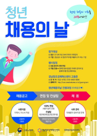 ◇ 경남센터, 취업박람회 개최=경남창조경제혁신센터가 창원고용복지플러스센터와 함께 ‘청년채용의 날! 맞춤형 취업박람회’를 오는 9월 5일 오후 2시부터 센터 2층 고용존에서 개최한다. 청년채용의 날 행사는 적극적인 구인의사가 있는 기업과 청년 구직자을 연결해주는 매칭 프로그램이다. 구인기업과 구직자간의 매칭가능성을 높이기 위해 소규모(2~3개 기업)로 추진 중이다. 이번 행사에는 ㈜정민기전, (주)삼현, (주)위딘(팔용동,신촌동 소재) 3개 기업이 참여한다. 채용인원은 13명 정도이다. 현장에서 면접을 통해 바로 일자리를 찾고자하는 청년구직자는 이력서를 가지고 당일 행사장으로 바로 참여하면 된다. 취업박람회 관련 신청 및 문의는 경남창조혁신센터 고용지원팀(070-4459-0094/1522-4755)으로 문의하면 된다.