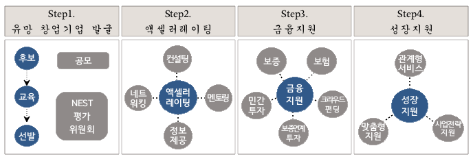 스타트업 네스트(Start-up NEST)는 신보가 올해 새롭게 도입한 창업기업 육성 플랫폼으로 ‘유망창업기업 발굴-액셀러레이팅-금융지원-성장지원’의 4단계로 구성된 One-stop 복합 지원 프로그램이다.