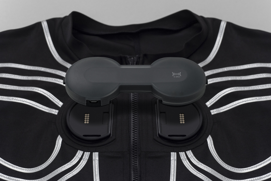 e-스킨 셔츠(e-skin Shirt)라고 불리는 티셔츠를 입고 가금 부분에 컨트롤러인 e-스킨 허브(e-skin Hub)를 설치해 이용하게 된다. 셔츠에는 신축 센서 14개를 탑재했고 허브에는 가속도계와 자이로센서, 6축 모션 센서 등을 곁들였다. 블루투스를 통해 스마트폰이나 PC에 접속해 데이터를 공유할 수 있는 건 물론.