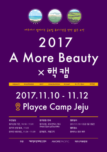 ◇ 아모레퍼시픽, 뷰티 융합 해커톤 개최=아모레퍼시픽이 다음달 10일 제주 성산 플레이스 캠프 제주에서 도내외 젊은 창의적 인재를 대상으로 ‘ICT 뷰티 융합 해커톤 캠프’를 개최한다. 이번 행사는 ‘2017 어모어뷰티X핵캠’이라는 타이틀로 글로벌 뷰티 시장을 리드할 아이디어와 솔루션을 발굴하여 기업, 기관, 인재 상호간에 교류의 기회를 마련하고자 하는 취지다.참가신청은 오는 11월 1일까지 15~34세까지의 도내외 청년을 대상으로 SEA 파트는 비주얼 분야(디자인 및 영상 등 크리에이티브 관련), OREUM 파트는 기획/마케팅 분야(비즈니스 및 상품 기획/마케팅, 세일즈 관련), STONE 파트는 IT/테크 분야(소프트웨어 및 하드웨어 개발기술 관련) 등 총 3개 파트로 나눠 신청 받는다. 자세한 프로그램 확인 및 등록은 모집 홈페이지 링크에서 가능하다.