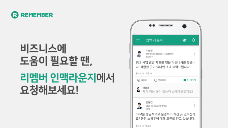 드라마앤컴퍼니가 만든 리멤버는 명함을 사진으로 찍어 저장할 수 있는 명함 관리 앱으로 지난 3월에는 메신저 기능을 추가했으며 7월에는 인맥라운지를 오픈해 리멤버 고객에게 인맥의 가치를 극대화할 수 있는 기회를 제공하고 있다.