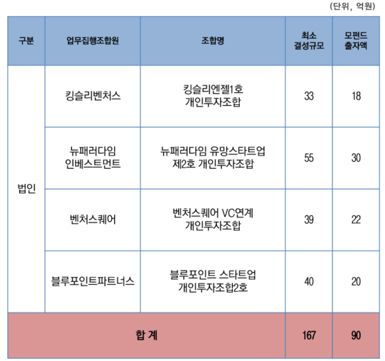 선정된 곳은 킹슬리벤처스와 뉴패러다임인베스트먼트, 벤처스퀘어, 블루포인트파트너스다. 벤처스퀘어는 39억 규모 벤처스퀘어VC연계 개인투자조합을 결성하게 된다. 킹슬리벤처스는 33억 규모 킹슬리엔젤1호 개인투자조합을, 뉴패러다임인베스트먼트는 55억 규모 뉴패러다임유망스타트업 제2호 개인투자조합을 운용한다. 블루포인트파트너스는 40억 규모 블루포인트 스타트업 개인투자조합을 만들어 투자에 나설 예정.