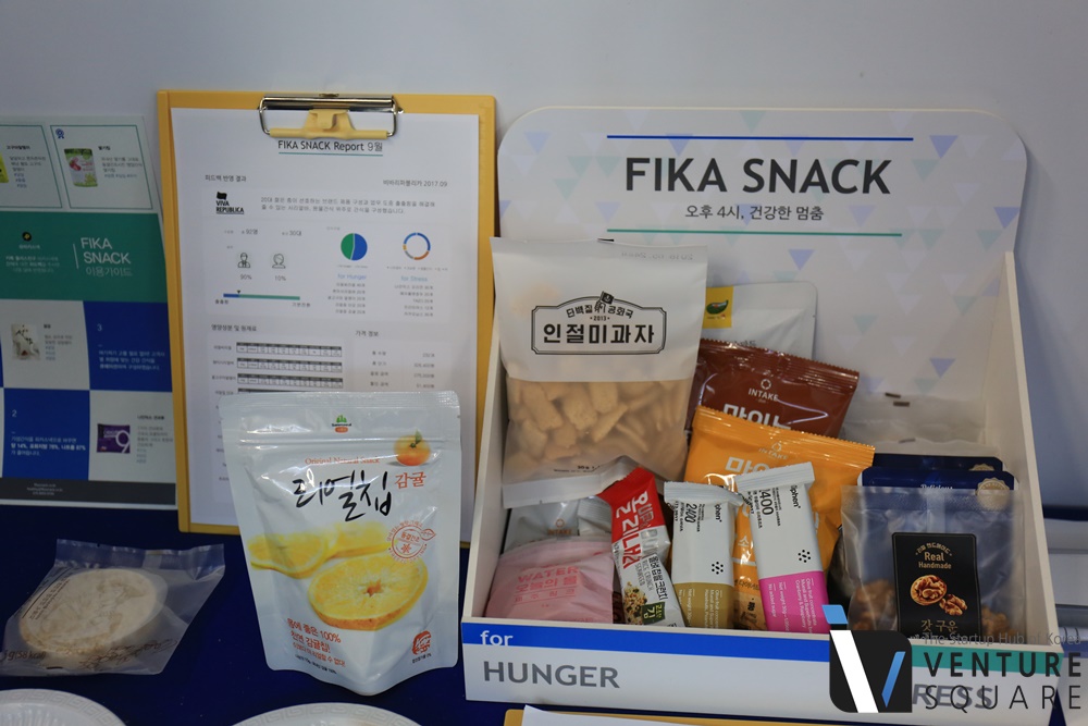 본능이란 참 무섭습니다. 두 다리가 마음대로 움직여 당도한 곳은 바로 회사를 위한 건강간식 피카입니다. 간식 구독신청을 하면 시리얼바와 견과류, 과일 건조칩, 차 등 다양한 간식이 정기적으로 사무실로 배송되는 서비스입니다. 기성 제품보다 당과 포화지방, 나트륨을 낮춘 건강 스낵세트로 제공된다고 합니다.