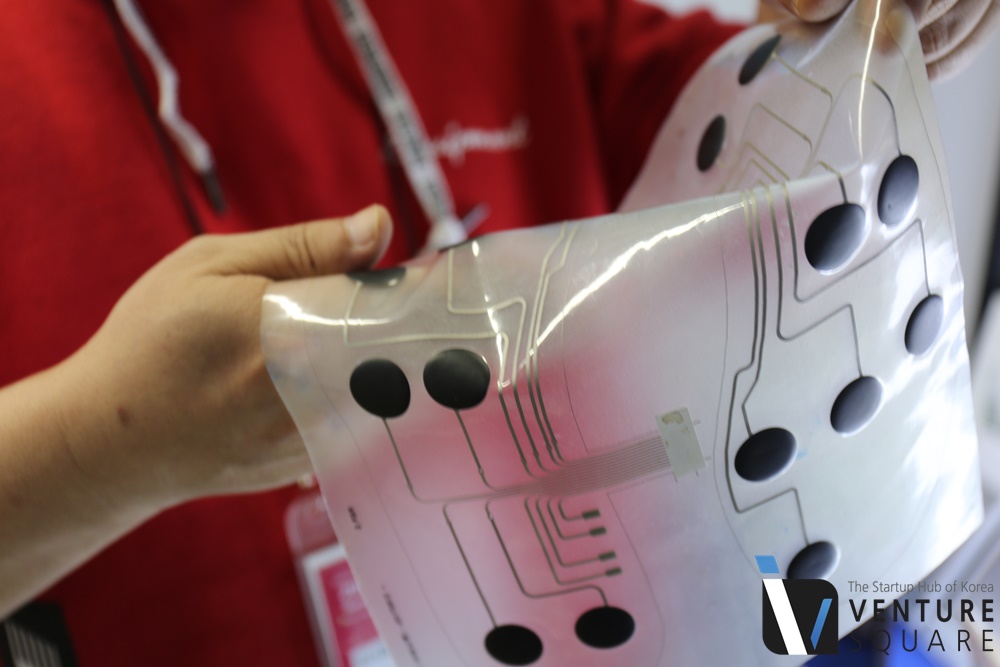 핵심기술은 접이식 웨어러블 PCB와 비닐보다 얇고 가벼운 압력센서입니다. 서 대표는 핵심기술을 국산화하면서 원가를 절감할 수 있었다고 합니다. 개발기간만 약 3년, 얇고 가벼운 위키는 일본과 독일, 중국으로 수출되고 있습니다.