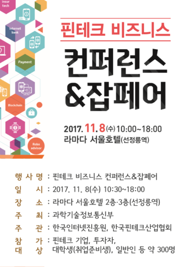 한국인터넷진흥원과 한국핀테크산업협회가 주관하고 과학기술정보통신부와 금융위원회가 후원하는 2017 핀테크 비즈니스 컨퍼런스& 잡페어가 8일 라마다 서울 호텔에서 오전 10시부터 오후 6시까지 열린다.