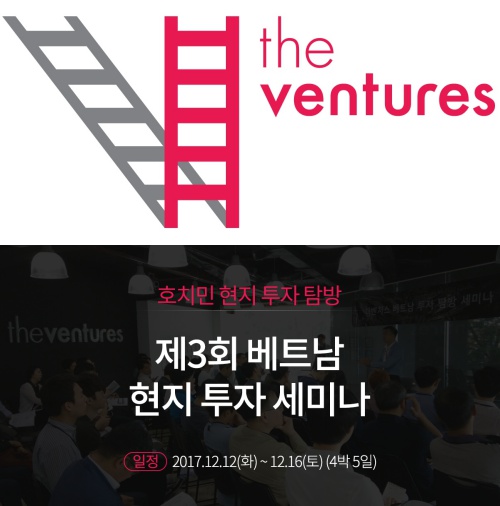 ◇ 더벤처스, 베트남 현지 투자 세미나 개최=더벤처스가 12월 12일부터 16일까지 베트남 투자를 희망하는 개인 투자자 및 정부기관, 기업 임직원을 대상으로 한 ‘제 3회 베트남 현지 투자 세미나 in 호치민’을 개최한다. 이번 세미나는 베트남 현지 ‘생산’, ‘판매’, ‘재테크’를 주제로 구성되었으며, 베트남에서 생산, 판매, 재테크로 성공한 실제 한인들의 생생한 사례 발표가 진행된다. 또한 베트남 기획투자부, 베트남 투자청, 베트남 상공회의소 등 베트남 현지 관계자들이 직접 세미나를 주관해 정확하고 믿을 수 있는 투자 정보를 제공한다. 특히 대한상공회의소 베트남사무소, 베트남 호치민 KOTRA 등의 현지 한국인 직원들을 통해 베트남 비즈니스 현황을 파악하고 실질적인 현지 네트워크를 쌓을 수 있는 기회다. 신청 마감은 12월 5일까지다. 효율적인 네트워크 구축과 심도 있는 개별 상담을 위해 참가자는 30명만 모집하며 선착순으로 마감된다. 참가 신청 및 보다 자세한 프로그램 내용은 여기에서 확인할 수 있다.