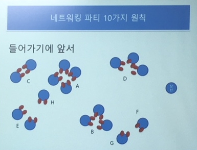 그 다음으로 공략(?)해야 하는 대상은 지인과 단둘이 온 E그룹이나 약간 거리를 두고 데면데면하게 떨어져 있는 G나 F그룹이 먼저 말을 건네기 좋다. 물론 ‘시작이 반’이라고 하지만 가볍게 인사를 나눈 후 그 다음 과정은 본인의 사업을 소개하고 상대방을 알아가는 데 있다. 네트워킹 행사는 엄연히 ‘give&take’를 위한 자리라는 것을 잊어서는 안된다.