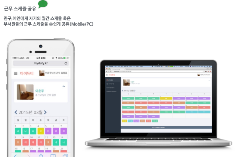 병원 간호사는 매달 근무 일정이 기록된 듀티표를 받는다. 이렇게 받은 듀티표는 보통 사진으로 찍어 보관하거나 종이로 출력해 확인하는데 마이듀티는 이 같은 아날로그 방식에서 벗어나 앱을 통해 월별 일정을 관리하고 쉽게 타인과 공유할 수 있게 했다.