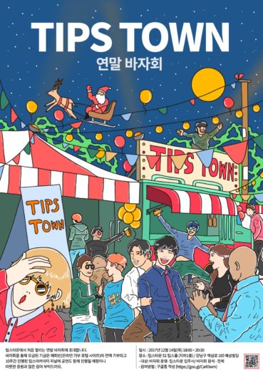◇ 팁스타운, 연말 바자회 개최=팁스타운이 오는 12월 14일(목) 오후 6시부터 역삼동 팁스타운에서 ‘2017년 팁스타운 연말 바자회’를 개최한다. 참가대상은 창업팀, 투자자, 예비창업자, 유관기관 등 스타트업 창업생태계와 궤를 함께하면 누구나 참가 가능하다. 푸드트럭, 강연, 특별 공연, 네트워킹이 예정돼 있으며 바자회 운영은 팁스타운 입주 인원으로 동별로 구성돼 가장 많은 모금을 한 동(S1,S2, S3)에게는 50만원 상당의 치킨 상품권을 증정한다. 참가 신청은 구글폼을 통해 여기서 가능하다.