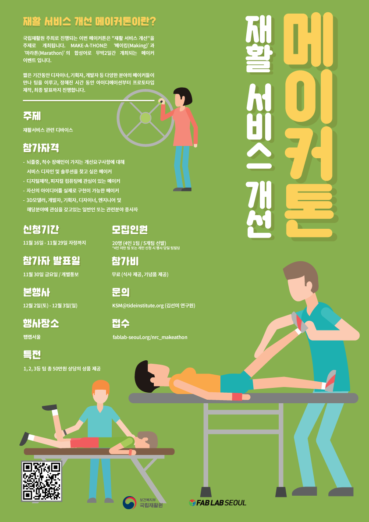 ◇ 국립재활원, 재활 서비스 개선 메이커톤 개최=국립재활원이 ‘재활 서비스 개선’을 주제로 12월 2일부터 3일까지 무박 2일로 팹랩서울에서 메이커톤을 개최한다. 메이커톤 참가 대상은 3D 모델러, 개발자, 기획자, 디자이너, 엔지니어 등 관련분야 종사자 및 해당 분야에 관심 있는 일반인이다. 참가자는 재활서비스 관련 디바이스 중에서 뇌졸중, 척수 장애인이 가지는 개선요구사항에 대해 서비스 디자인 및 솔루션을 구체화하는 과정을 거치게 된다. 참가인원은 총 20명으로 4인 1팀 구성이다. 참가비는 무료로 식사, 간식이 제공된다. 참가신청은 여기로 하면된다.