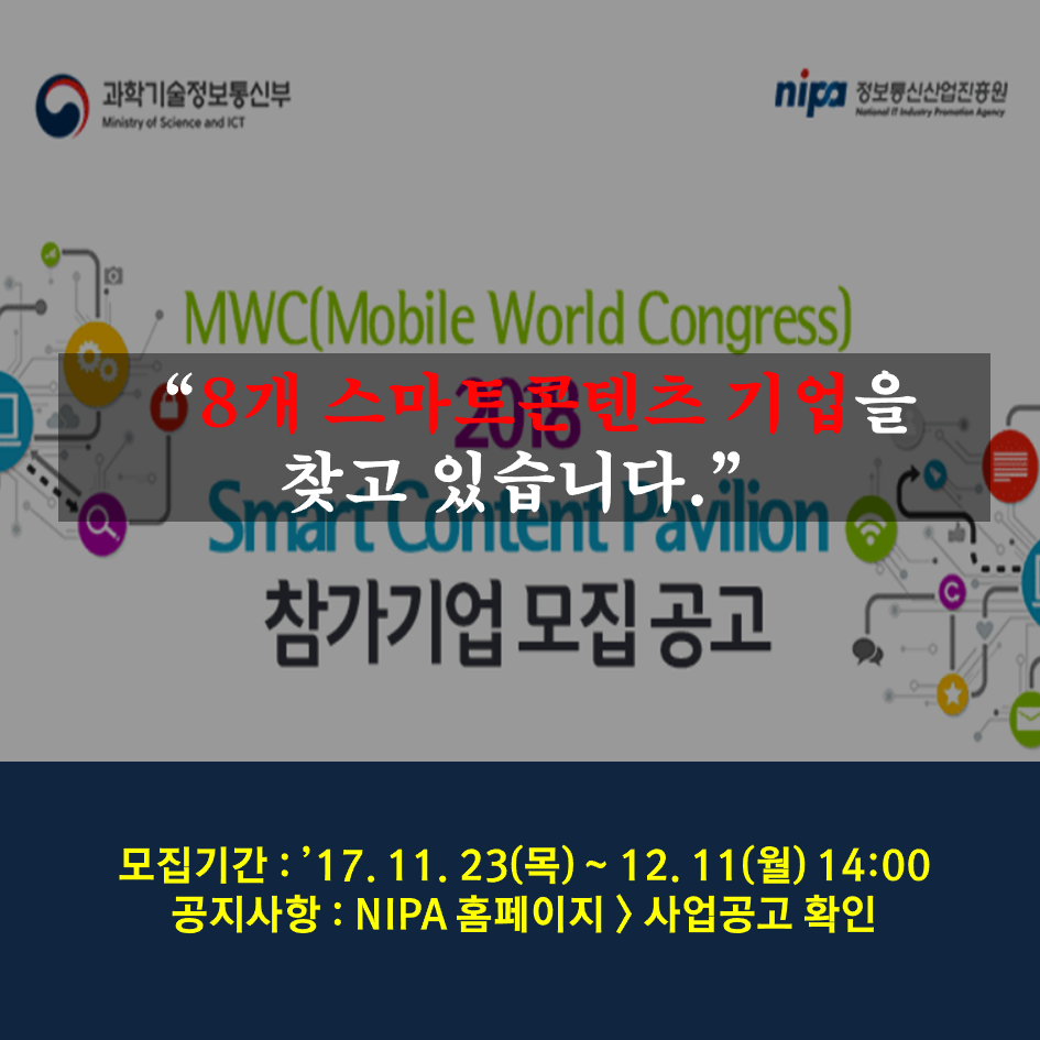 ◇ MWC 2018 한국 공동관 지원 기업 모집=정보통신산업진흥원이 내년 2월 스페인 바르셀로나에서 열리는 MWC 2018 한국 공동관 지원 기업을 모집한다. 지원 대상은 부스와 비즈매칭, 네트워크 리셉션 등이며 모두 8개 기업을 선정한다. 조건은 해외 수출 실적을 보유한 국내 스마트 콘텐츠 기업이어야 하며 수출 실적 관련 증빙 자료 제출이 필수다. 정보통신산업진흥원은 참여 기업 중 1차 서류 심사와 2차 질의응답평가를 거쳐 최종 지원 과제를 선정할 예정이다. 접수 기간은 11월 23일부터 12월 11일까지이며 제안서와 개인정보 수집이용제공동의서, 수출증빙서류를 정보통신산업진흥원 홈페이지를 통해 온라인 제출하면 된다. 관련 내용은 이곳에서 확인할 수 있다.