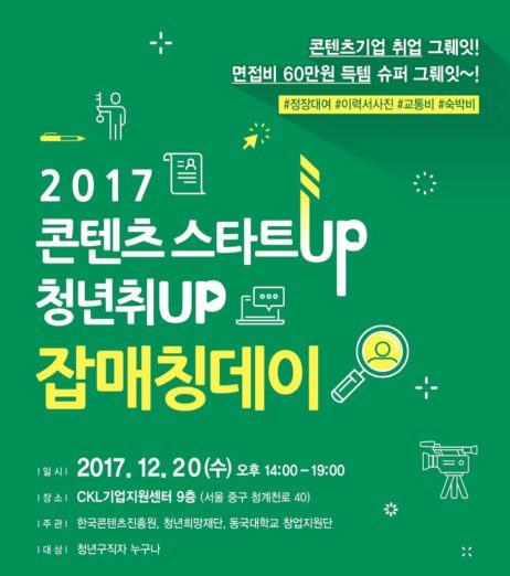 ◇ 한콘진, 콘텐츠 스타트업 잡매칭데이 개최=한국콘텐츠진흥원은 콘텐츠 스타트업과 청년구직자 일자리 지원을 위한 ‘2017 콘텐츠 스타트UP-청년취UP 잡매칭데이’를 오는 20일 서울 중구 CKL기업지원센터에서 개최한다. 청년구직자는 구인기업의 정보를 확인하고 현장에서 원하는 콘텐츠 스타트업과 현장에서 면접이 가능하다. 이번 행사에 참여한 구직자를 채용한 기업에게는 청년희망재단을 통해 인재지원금이 지원되며 청년구직자에게는 면접지원금을 지원할 예정이다. 참가를 희망하는 구직자는 청년희망재단 홈페이지를 통해 신청이 가능하며 기타 자세한 내용은 CKL일자리지원사무국(02-6441-3791, cklstartup@kocca.kr)로 문의하면 된다.